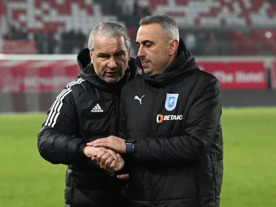 Antrenorii celor doua echipe Bernd Storck si Bogdanov Ivaylo Petev discuta dupa meciul de fotbal dintre Sepsi OSK Sfantu Gheorghe si Universitatea Craiova, contand pentru Superliga Superbet, desfasurat pe Sepsi Arena din Sfantu Gheorghe, duminica 4 februarie 2024. © FOTO:Razvan Pasarica/SPORT PICTURES