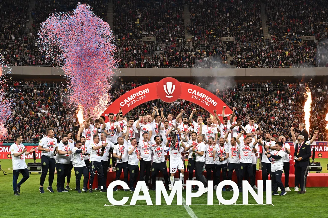 Fotbalistii stelisti alături de staff si Ilie Nastase celebreaza castigarea Superligii in urma meciului dintre FCSB si CFR Cluj, desfășurat pe Arena Nationala din Bucuresti, sambata 11 mai 2024. © FOTO: Razvan Pasarica/SPORT PICTURES