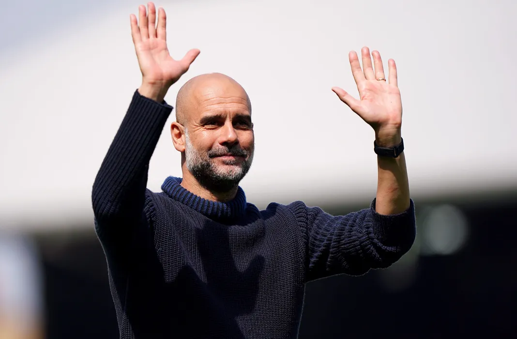 11 May 2024, United Kingdom, London: Manchester City manager Pep Guardiola celebrates after the English Premier League soccer match between Fulham and Manchester City at Craven Cottage, London. Photo: Zac Goodwin/PA Wire/dpa
