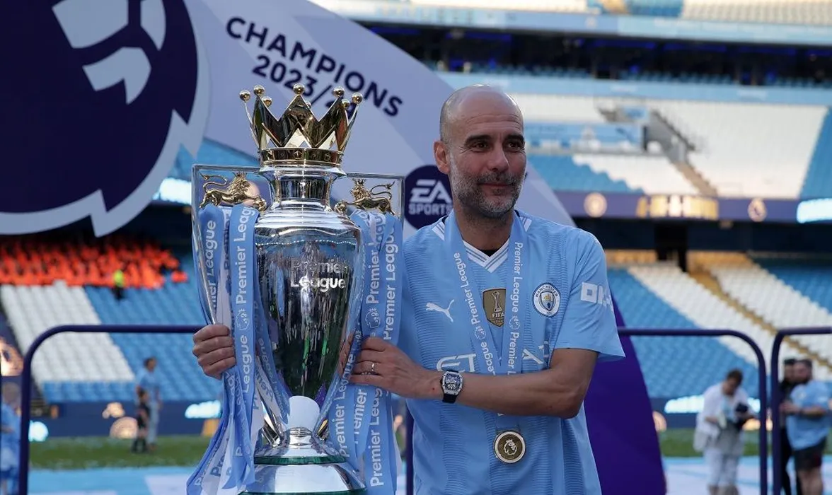 19th May 2024 Etihad Stadium, Manchester, England Premier League Football, Manchester City versus West Ham United Manchester City manager Pep Guardiola poses with the Premier League trophy PUBLICATIONxNOTxINxUK ActionPlus12645312 DavidxBlunsden