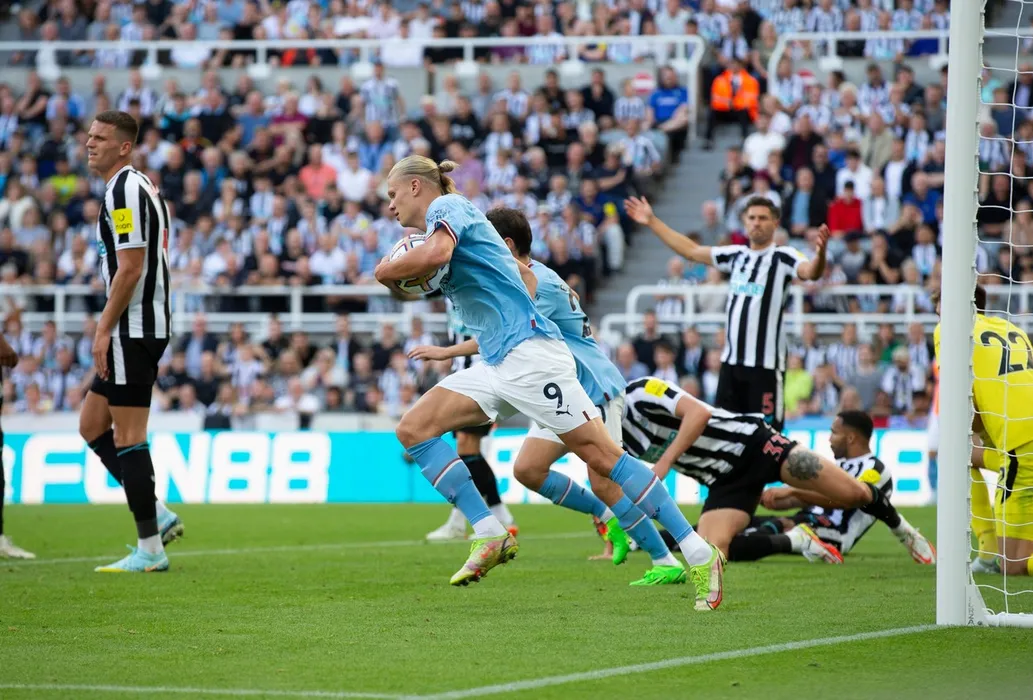 Football - 2022 / 2023 Premier League - Newcastle United vs Manchester City - St James Park - Sunday 21st August 2022 Erling Haaland of Manchester City scores to make it 3-2 to Newcastle United Credit: COLORSPORT / Bruce White Newcastle United v Manchester City, Premier League, Football, St James' Park, Newcastle, UK - 21 Aug 2022,Image: 715606446, License: Rights-managed, Restrictions: EDITORIAL USE ONLY No use with unauthorised audio, video, data, fixture lists, club/league logos or "live" services. Online in-match use limited to 120 images, no video emulation. No use in betting, games or single club/league/player publications., Model Release: no