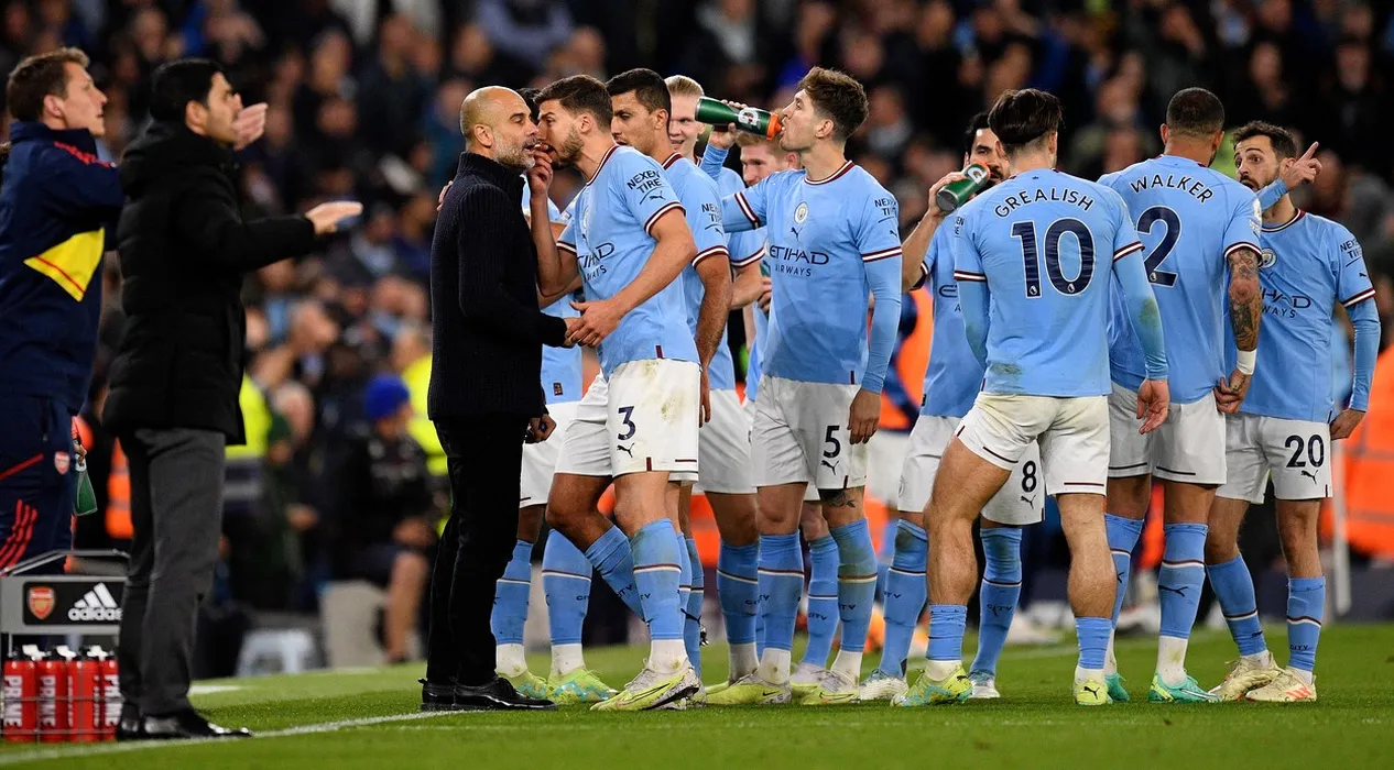 Manchester City's Spanish manager Pep Guardiola (3L) gives his players a pep talk after their third goal during the English Premier League football match between Manchester City and Arsenal at the Etihad Stadium in Manchester, north west England, on April 26, 2023.,Image: 772109215, License: Rights-managed, Restrictions: RESTRICTED TO EDITORIAL USE. No use with unauthorized audio, video, data, fixture lists, club/league logos or 'live' services. Online in-match use limited to 120 images. An additional 40 images may be used in extra time. No video emulation. Social media in-match use limited to 120 images. An additional 40 images may be used in extra time. No use in betting publications, games or single club/league/player publications., Model Release: no