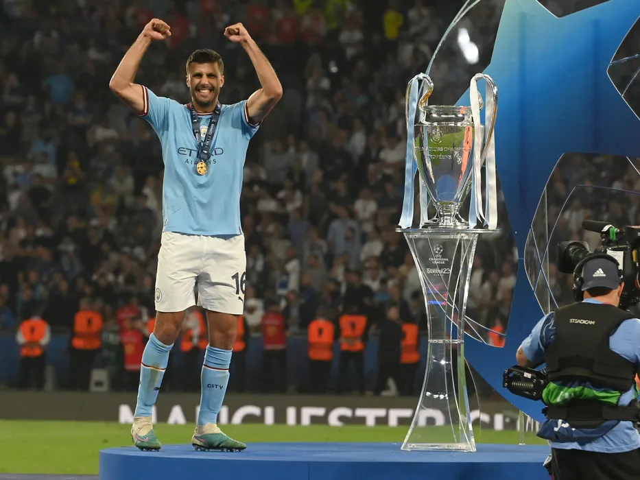 Rodri se bucura alaturi de trofeu la festivitatea de premiere de dupa meciul de fotbal dintre Manchester City si FC Internazionale Milano, finala Ligii Campionilor, desfasurat pe Stadionul Olimpic Ataturk din Istanbul, sambata 10 iunie 2023. © FOTO:Razvan Pasarica/SPORT PICTURES