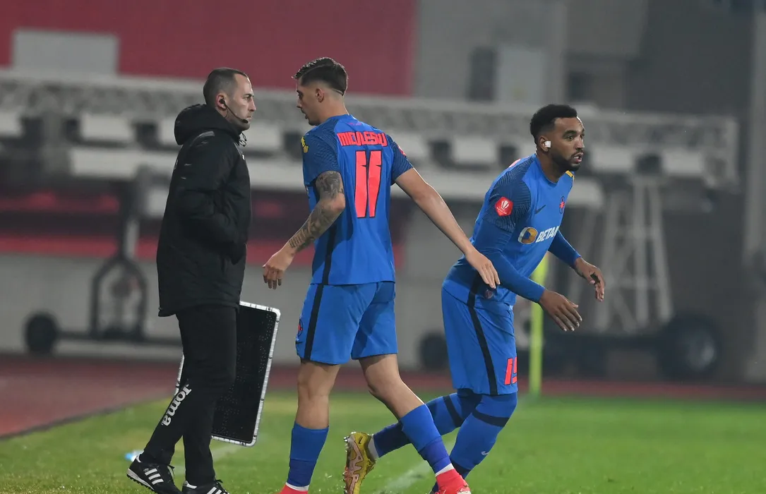 Abdel Slem Billel Omrani il inlocuieste pe David Raul Miculescu sub privirile arbitrului de rezerva Ionut Coza in meciul de fotbal dintre FC Hermannstadt si FCSB, contand pentru Superliga Superbet, desfasurat pe Stadionul Municipal din Sibiu, duminica 22 ianuarie 2023. © FOTO:Razvan Pasarica/SPORT PICTURES