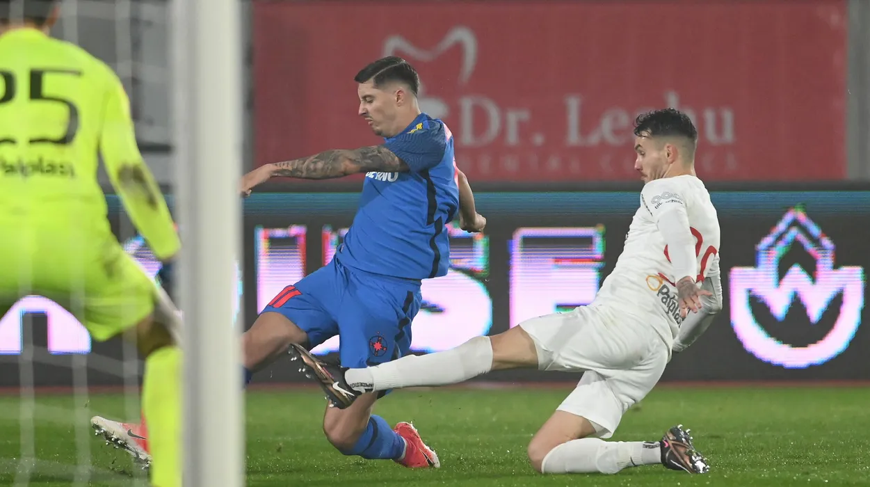 David Raul Miculescu si Raul Marian Oprut in meciul de fotbal dintre FC Hermannstadt si FCSB, contand pentru Superliga Superbet, desfasurat pe Stadionul Municipal din Sibiu, duminica 22 ianuarie 2023. © FOTO:Razvan Pasarica/SPORT PICTURES