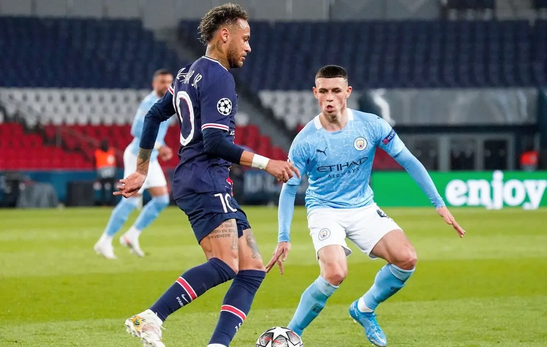 Neymar Jr of PSG and Phil Foden of Manchester City