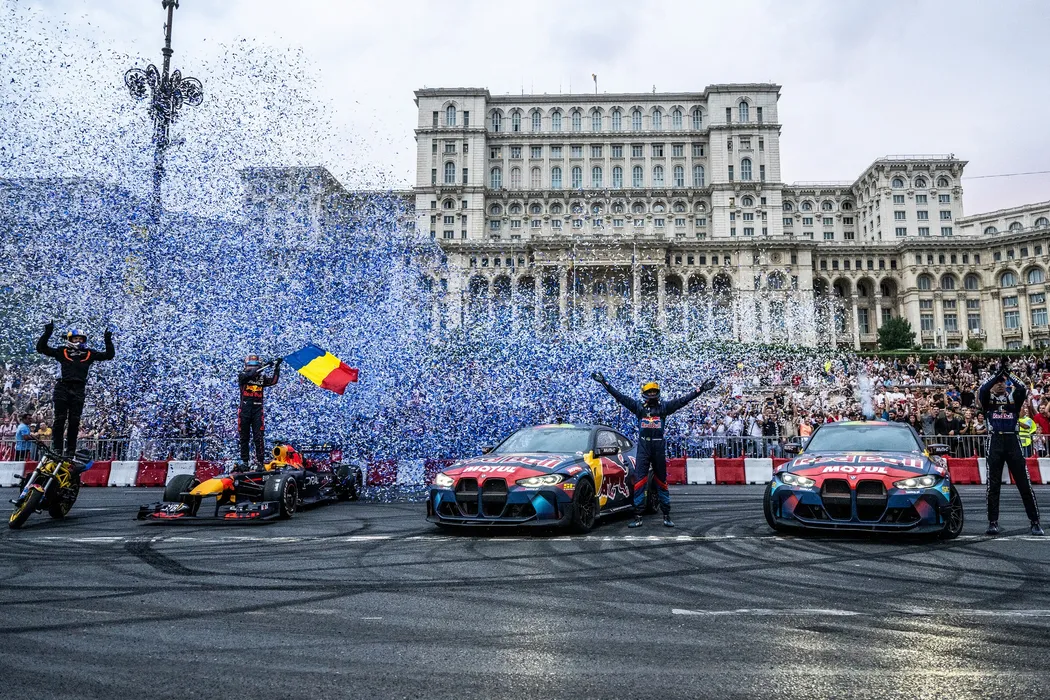 The Driftbrothers, Elias and Joe Hountondji of Germany, Aras Gibieza of Lithuania and Patrick Friesacher of Austria seen during the Red Bull Racing Showrun in Bucharest, Romania on September 10, 2022. // Predrag Vuckovic / Red Bull Content Pool // SI202209110034 // Usage for editorial use only //