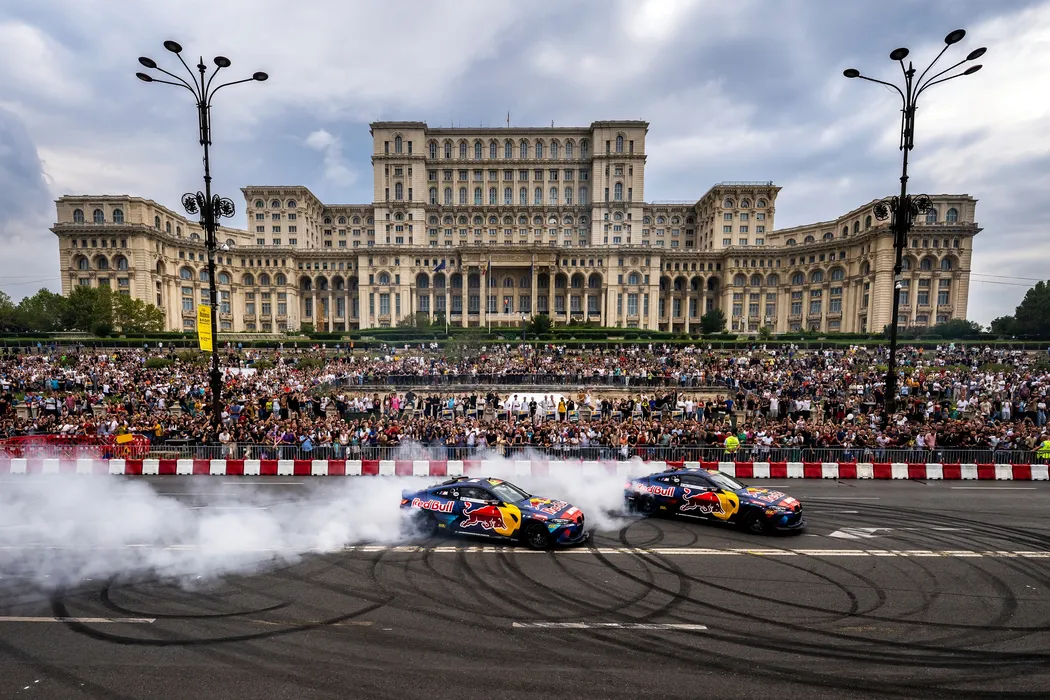 The Driftbrothers, Elias and Joe Hountondji of Germany, perform during the Red Bull Racing Showrun in Bucharest, Romania on September 10, 2022. // Joerg Mitter / Red Bull Content Pool // SI202209110062 // Usage for editorial use only //