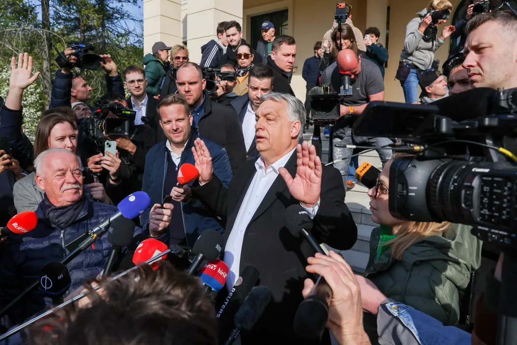 12 April 2026, Hungary, Budapest: Hungarian Prime Minister Viktor Orban, chairman and prime ministerial candidate of the ruling Fidesz party, speaks to the media after voting on the parliamentary elections in Budapest. Photo: Alexander Ryumin/TASS via ZUMA Press/dpa