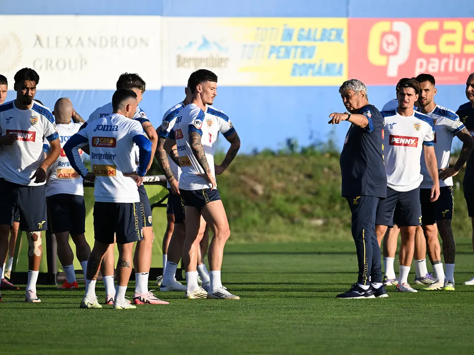 Fotbalistii romani Stefan Baiaram, Dennis Man, Răzvan Marin si Marius Marin alaturi de antrenorul lor Mircea Lucescu la antrenamentul oficial de dinaintea meciului amical impotriva Canadei, desfasurat la Centrul National de Fotbal de la Mogosoaia, joi 4 septembrie 2025. © FOTO:Razvan Pasarica/SPORT PICTURES