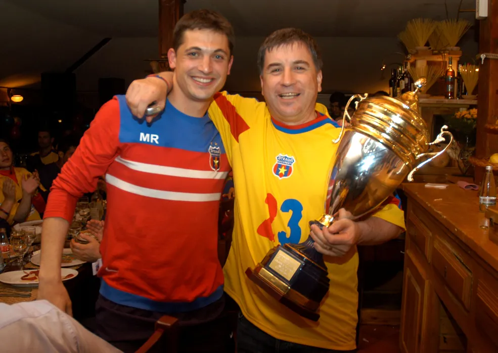 Mirel Radoi si Valeriu Argaseala se fotografiaza alaturi de trofeul pentru castigatoarea campionatului.