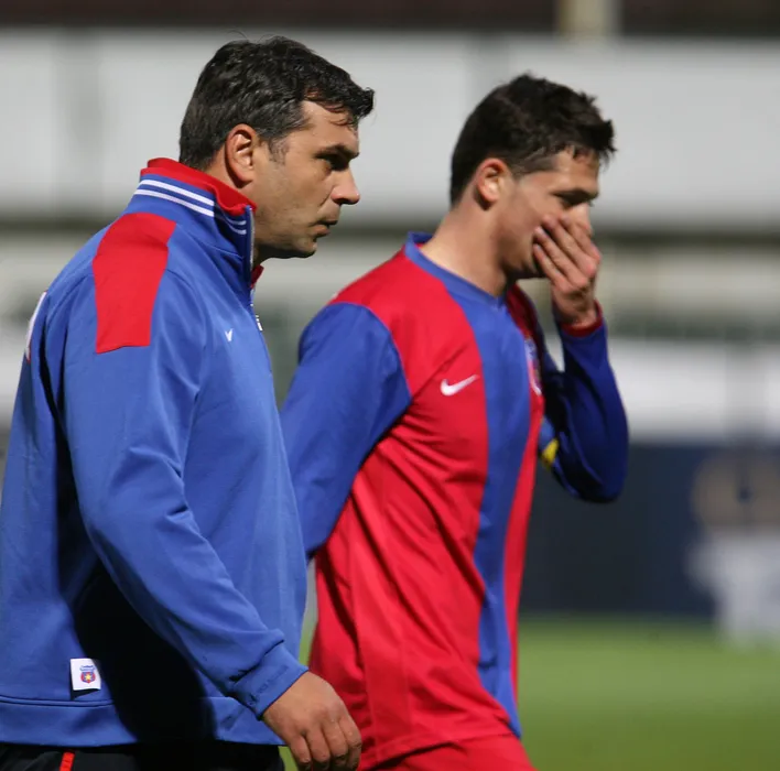 Antrenorul echipei Steaua Bucuresti, Cosmin Olaroiu (S) si Mirel Radoi se retrag de pe teren, in finalul meciului cu Poli Timisoara din semifinalele Cupei Romaniei, in Bucuresti, miercuri, 18 aprilie 2007. CONSTANTIN VLADESCU / MEDIAFAX FOTO