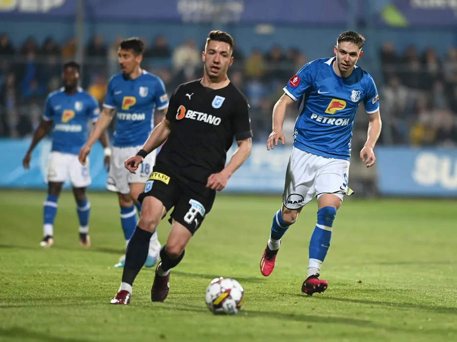 Alexandru Mateiu si Louis Munteanu in meciul de fotbal dintre Farul Constanta si Universitatea Craiova, contand pentru Play-off-ul Superligii Superbet, desfasurat pe Stadionul central al Academiei Gheorghe Hagi din Ovidiu, sambata 8 aprilie 2023. © FOTO:Razvan Pasarica/SPORT PICTURES