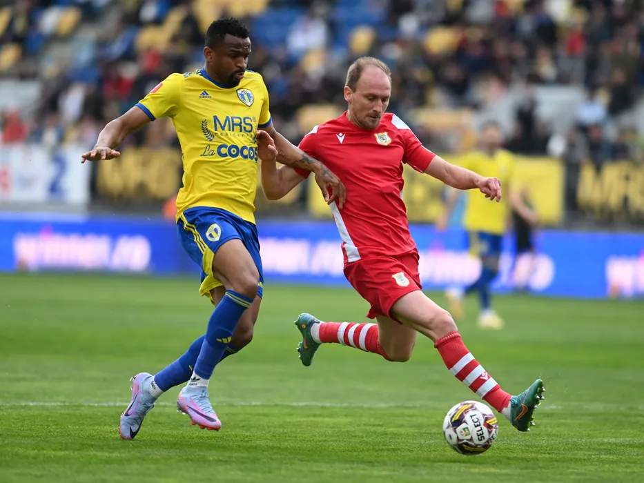 Okechukwu Christian Irobiso si Manuel Adrian Scarlatache in meciul de fotbal dintre Petrolul Ploiesti si CS Mioveni, contand pentru Play-out-ul Superligii Superbet, desfasurat pe Stadionul Ilie Oana din Ploiesti, luni 10 aprilie 2023. © FOTO:Razvan Pasarica/SPORT PICTURES