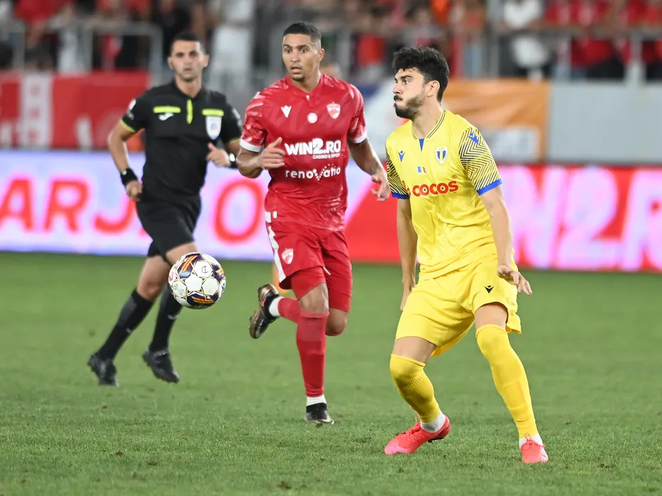 Quentin Alexandre Julien Bena si Mihai Alexandru Roman in meciul de fotbal dintre Dinamo Bucuresti si Petrolul Ploiesti, din cadrul Superligii Superbet, desfasurat pe Stadionul National Arcul de Triumf din Bucuresti, sambata 26 august 2023. © FOTO:Razvan Pasarica/SPORT PICTURES