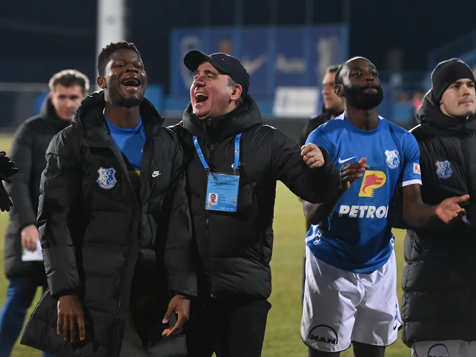 Fotbalistii constanteni Mihai Popescu si Kevin Gnoher Boli alaturi de Gheorghe Hagi saluta galeria dupa meciul de fotbal dintre Farul Constanta si Petrolul Ploiesti, contand pentru Superliga Superbet, desfasurat pe Stadionul central al Academiei Gheorghe Hagi din Ovidiu, sambata 18 februarie 2023. © FOTO:Razvan Pasarica/SPORT PICTURES