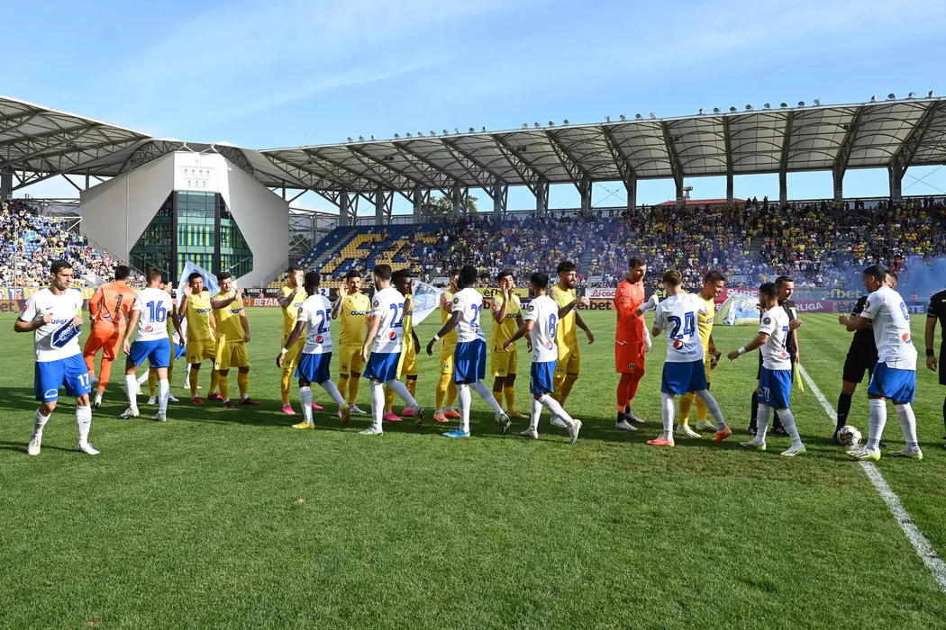 Cele doua echipe la startul meciului de fotbal dintre Petrolul Ploiesti si Farul Constanta, din cadrul Superligii Superbet, desfasurat pe Stadionul Ilie Oana din Ploiesti, duminica 6 august 2023. © FOTO:Razvan Pasarica/SPORT PICTURES