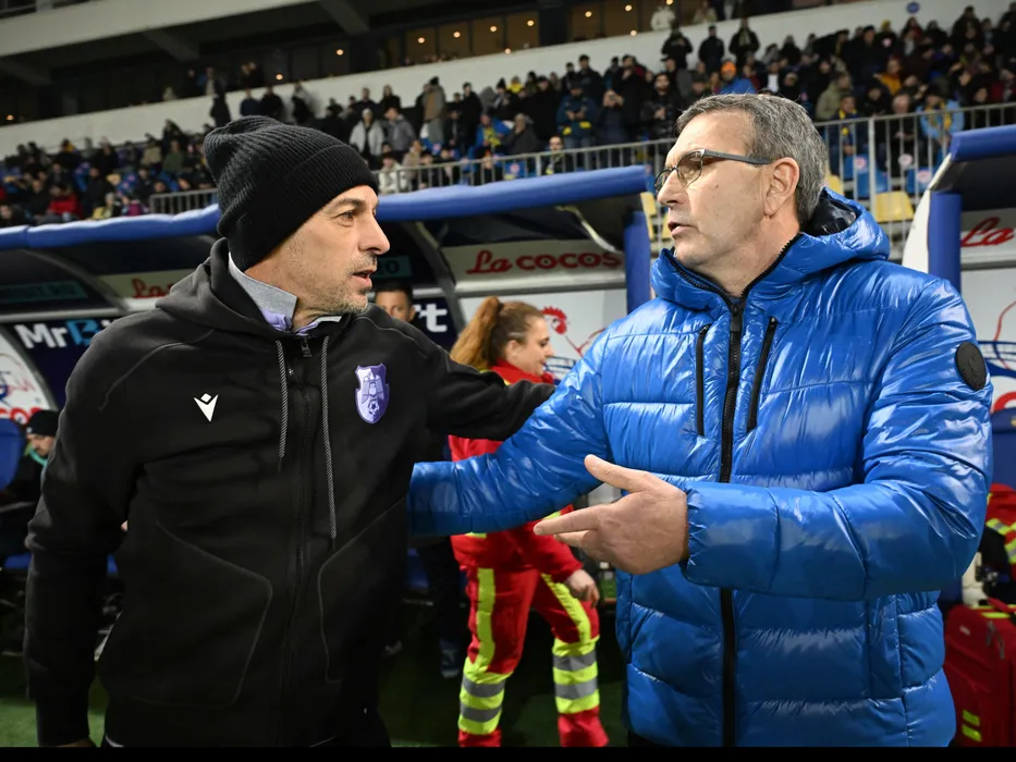 Antrenorii celor doua echipe Bogdan Ioan Andone si Eugen Neagoe se saluta inaintea meciului de fotbal dintre Petrolul Ploiesti si FC Arges, contand pentru Superliga Superbet, desfasurat pe Stadionul Ilie Oana din Ploiesti, vineri 13 februarie 2026. © FOTO:Razvan Pasarica/SPORT PICTURES