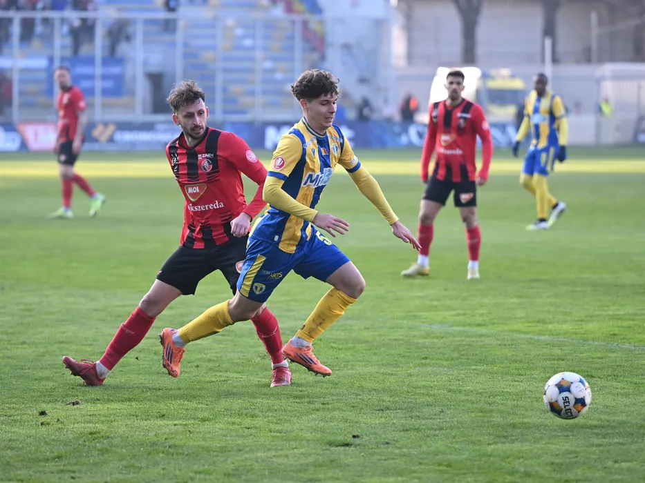 Razvan Alin Trif si Rares Mihai Pop in meciul de fotbal dintre Petrolul Ploiesti si FK Csikszereda Miercurea Ciuc, contand pentru Superliga Superbet, desfasurat pe Stadionul Ilie Oana din Ploiesti, duminica 1 martie 2026. © FOTO:Razvan Pasarica/SPORT PICTURES