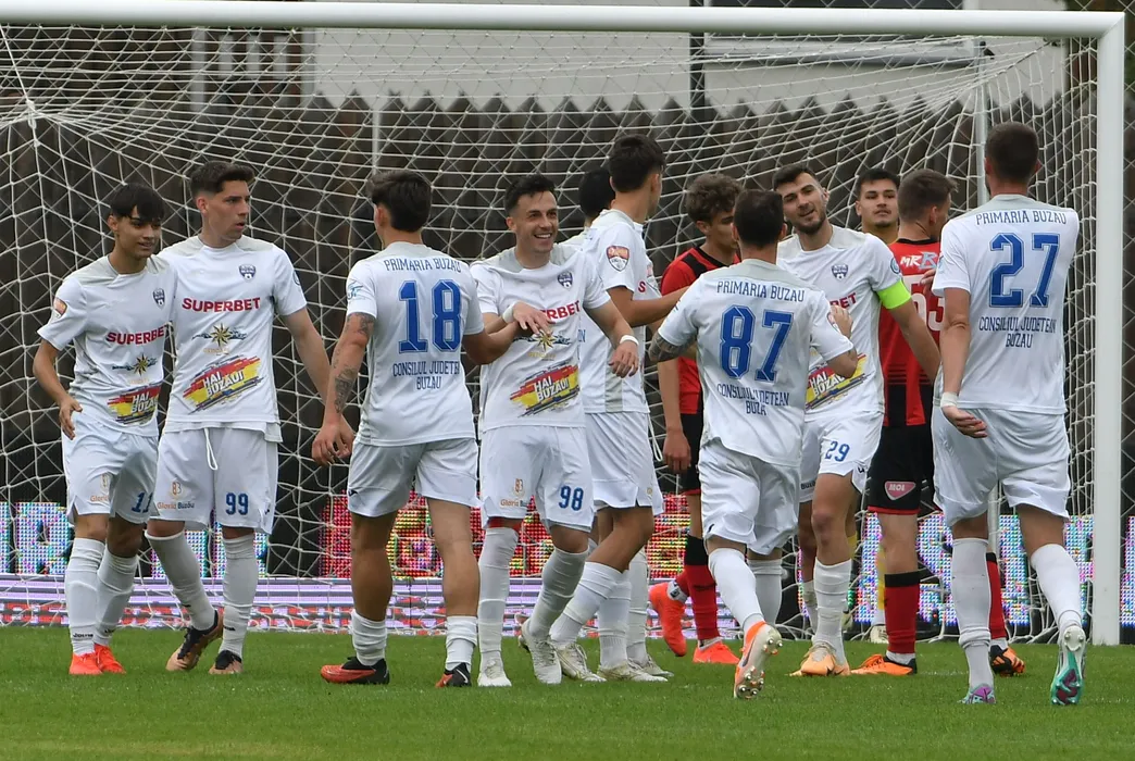 Fotbaliștii buzoieni se bucură după un gol marcat în meciul de fotbal dintre AFK Csikszereda Miercurea Ciuc și Gloria Buzău, contând pentru Liga 2 Casa Pariurilor Play-Off, desfășurat pe Stadionul Municipal din Miercurea Ciuc, sâmbătă 11 mai 2024. © FOTO: Bogdan BALAS/SPORT PICTURES