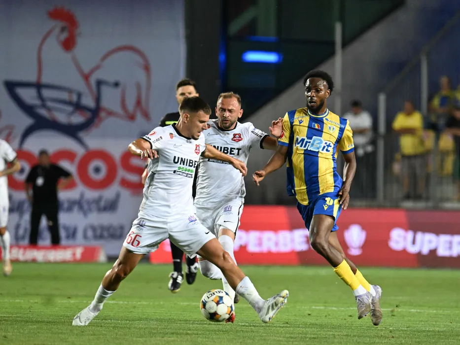 Tiberiu Ionut Capusa, Silviu Nicolae Balaure si Brahima Doukansy in meciul dintre Petrolul Ploiesti si FC Hermannstadt, contand pentru Superliga Superbet, desfasurat pe Stadionul Ilie Oana din Ploiesti, sambata 16 august 2025. © FOTO:Razvan Pasarica/SPORT PICTURES