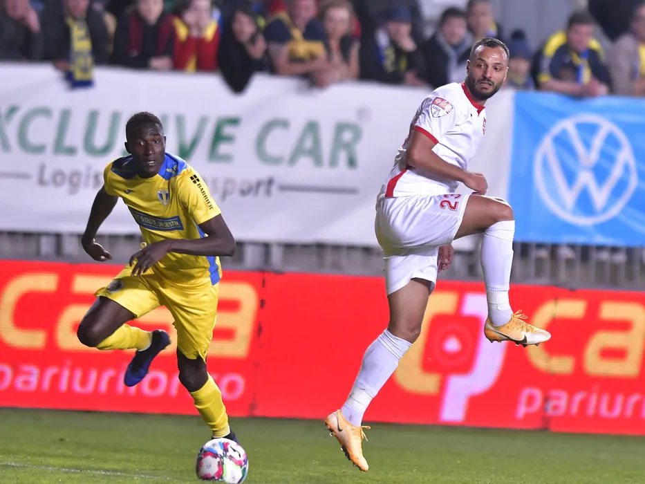 Sory Ibrahim Diarra si Florin Bejan in meciul de fotbal dintre Petrolul Ploiesti si AFC Hermannstadt, contand pentru Play-off-ul Ligii a-2-a Casa Pariurilor, desfasurat pe Stadionul Ilie Oana din Ploiesti, miercuri 6 aprilie 2022. © FOTO:Razvan Pasarica/SPORT PICTURES