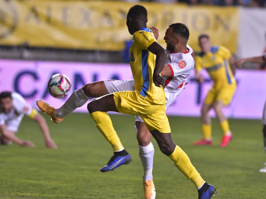 Sory Ibrahim Diarra si Florin Bejan in meciul de fotbal dintre Petrolul Ploiesti si AFC Hermannstadt, contand pentru Play-off-ul Ligii a-2-a Casa Pariurilor, desfasurat pe Stadionul Ilie Oana din Ploiesti, miercuri 6 aprilie 2022. © FOTO:Razvan Pasarica/SPORT PICTURES