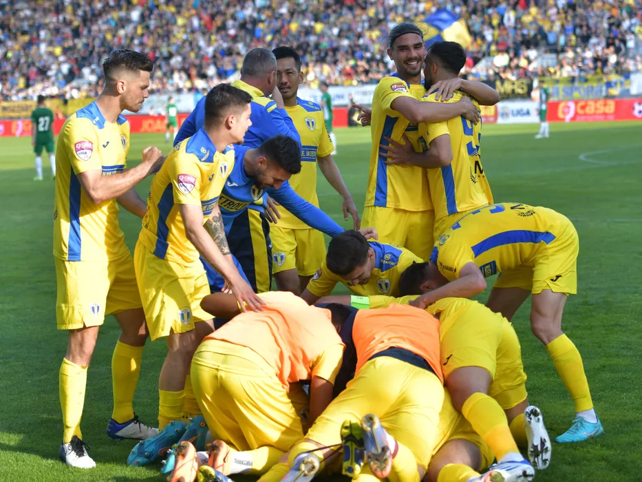 Bucurie a fotbalistilor ploiesteni Bart Adrianus Johannes Meijers, Sergiu Mihai Parvulescu, Seto Takayuki si Marian Fernando Huja dupa un gol marcat in meciul de fotbal dintre Petrolul Ploiesti si Concordia Chiajna, contand pentru Play-off-ul Ligii a-2-a Casa Pariurilor, desfasurat pe Stadionul Ilie Oana din Ploiesti, luni 9 mai 2022. © FOTO:Razvan Pasarica/SPORT PICTURES