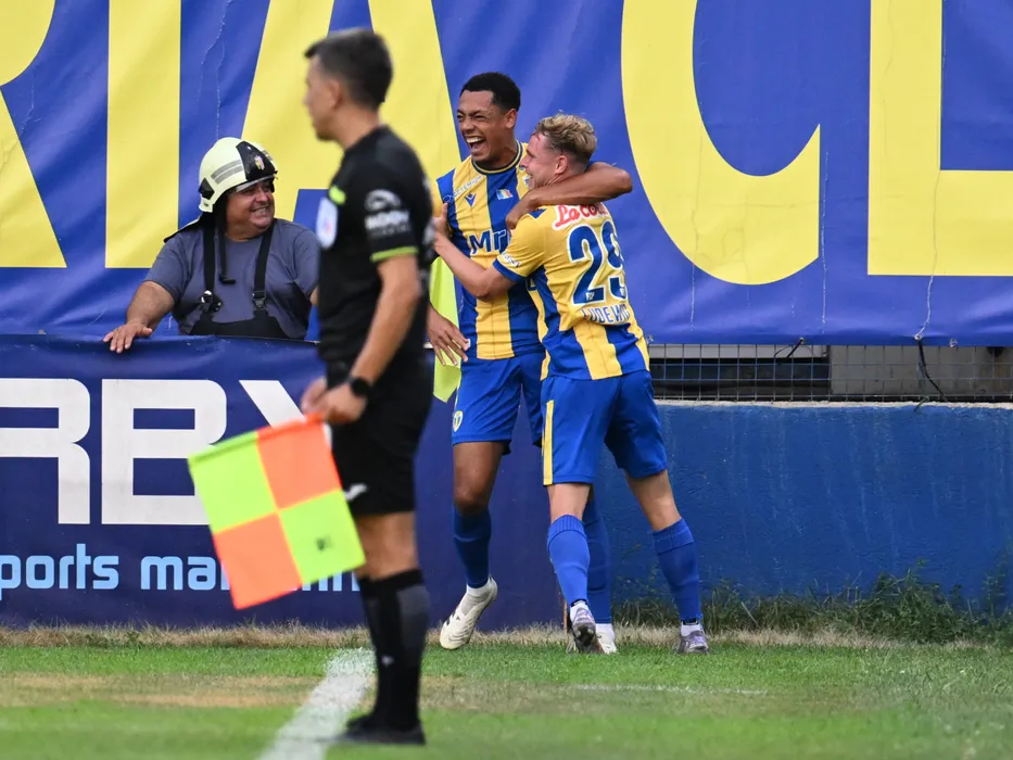 Cedric Benjamin Roche Yohan se bucură dupa un gol marcat alături de Kilian Ludewig in meciul de fotbal dintre Metaloglobus Bucuresti si Petrolul Ploiesti, contand pentru Superliga Superbet, desfasurat pe Clinceni Arena din Clinceni, vineri 25 iulie 2025. © FOTO:Razvan Pasarica/SPORT PICTURES