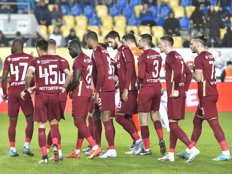 Fotbalistii clujeni la startul meciului de fotbal dintre Petrolul Ploiesti si CFR Cluj, contand pentru Superliga Superbet, desfasurat pe Stadionul Ilie Oana din Ploiesti, luni 27 februarie 2023. © FOTO:Razvan Pasarica/SPORT PICTURES