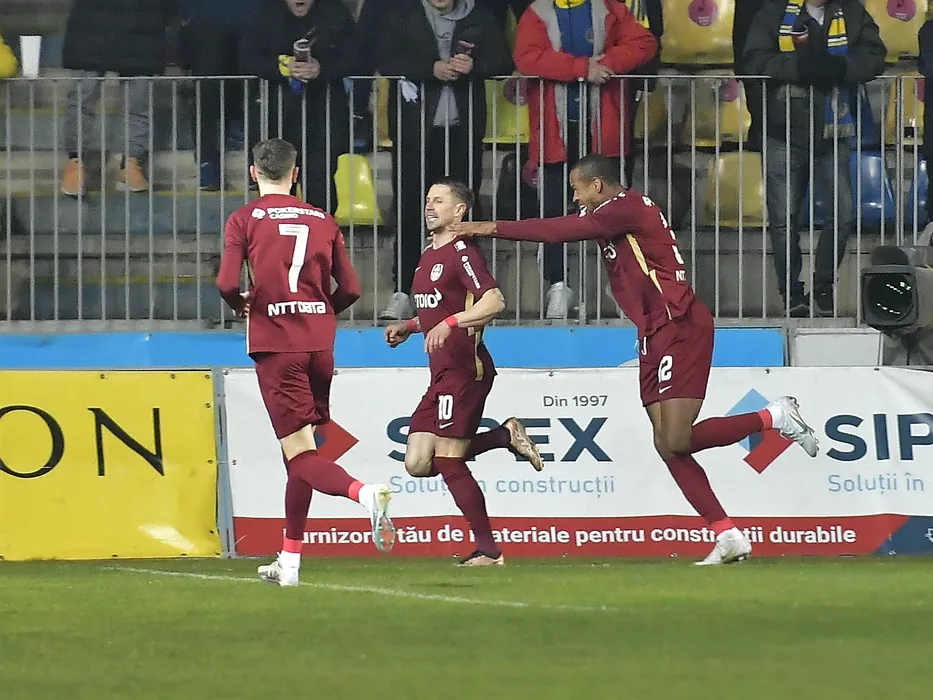 Bucurie a fotbalistilor clujeni dupa un gol marcat cu Ciprian Ioan Deac si Rangelo Maria Janga in meciul de fotbal dintre Petrolul Ploiesti si CFR Cluj, contand pentru Superliga Superbet, desfasurat pe Stadionul Ilie Oana din Ploiesti, luni 27 februarie 2023. © FOTO:Razvan Pasarica/SPORT PICTURES