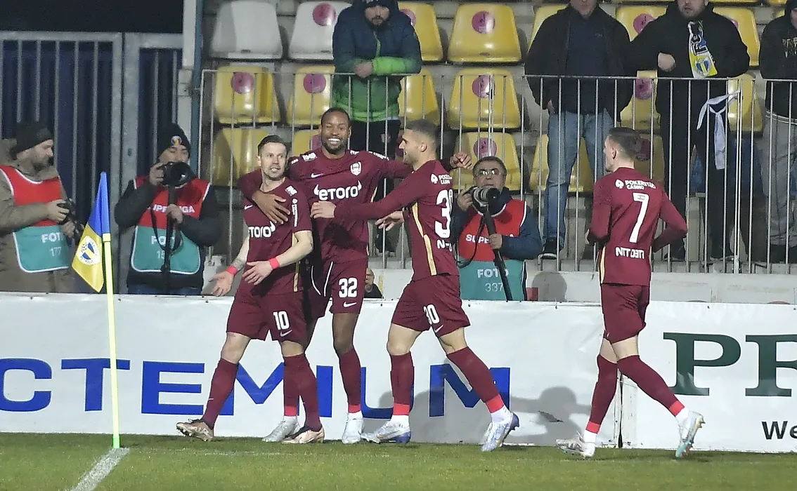 Bucurie a fotbalistilor clujeni dupa un gol marcat cu Ciprian Ioan Deac, George Daniel Birligea, Ermal Krasniqi si Rangelo Maria Janga in meciul de fotbal dintre Petrolul Ploiesti si CFR Cluj, contand pentru Superliga Superbet, desfasurat pe Stadionul Ilie Oana din Ploiesti, luni 27 februarie 2023. © FOTO:Razvan Pasarica/SPORT PICTURES