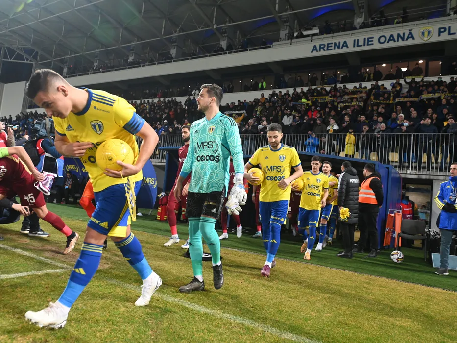 Fotbalistii ploiesteni Marian Fernando Huja, Andreas Leitner si Gheorghe Teodor Grozav la startul meciului de fotbal dintre Petrolul Ploiesti si CFR Cluj, contand pentru Superliga Superbet, desfasurat pe Stadionul Ilie Oana din Ploiesti, luni 27 februarie 2023. © FOTO:Razvan Pasarica/SPORT PICTURES