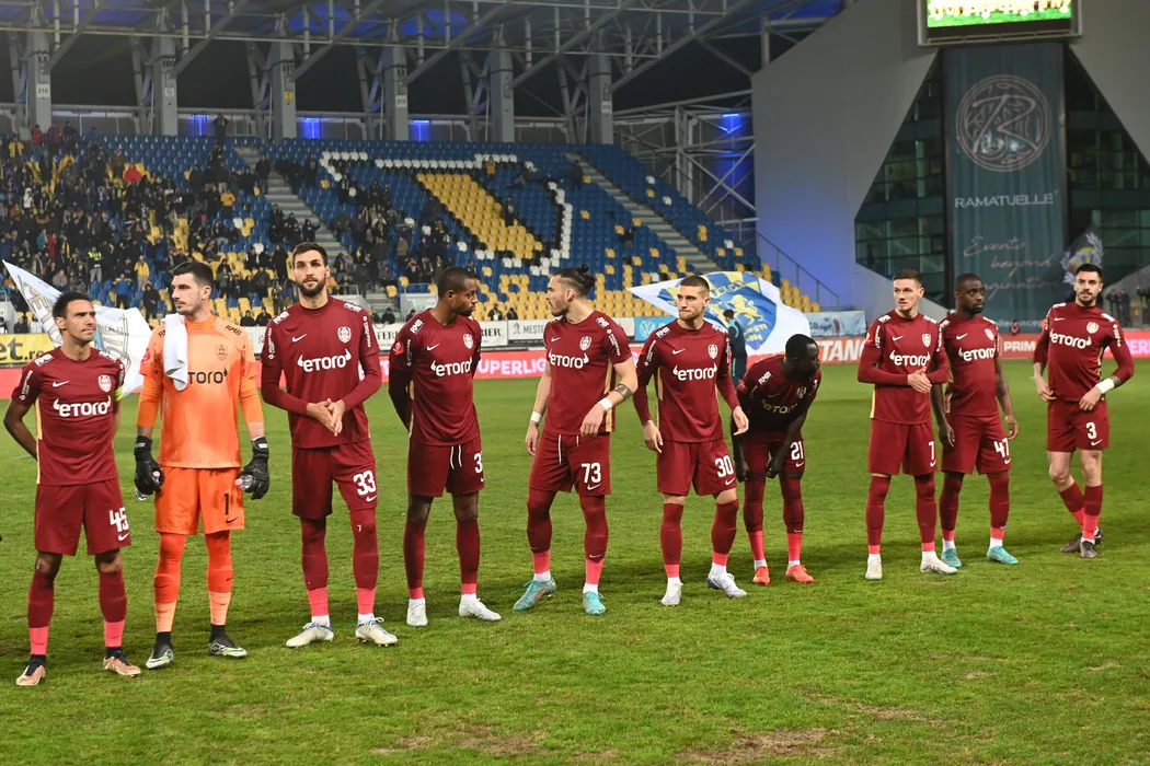 Fotbalistii clujeni la startul meciului de fotbal dintre Petrolul Ploiesti si CFR Cluj, contand pentru Superliga Superbet, desfasurat pe Stadionul Ilie Oana din Ploiesti, luni 27 februarie 2023. © FOTO:Razvan Pasarica/SPORT PICTURES