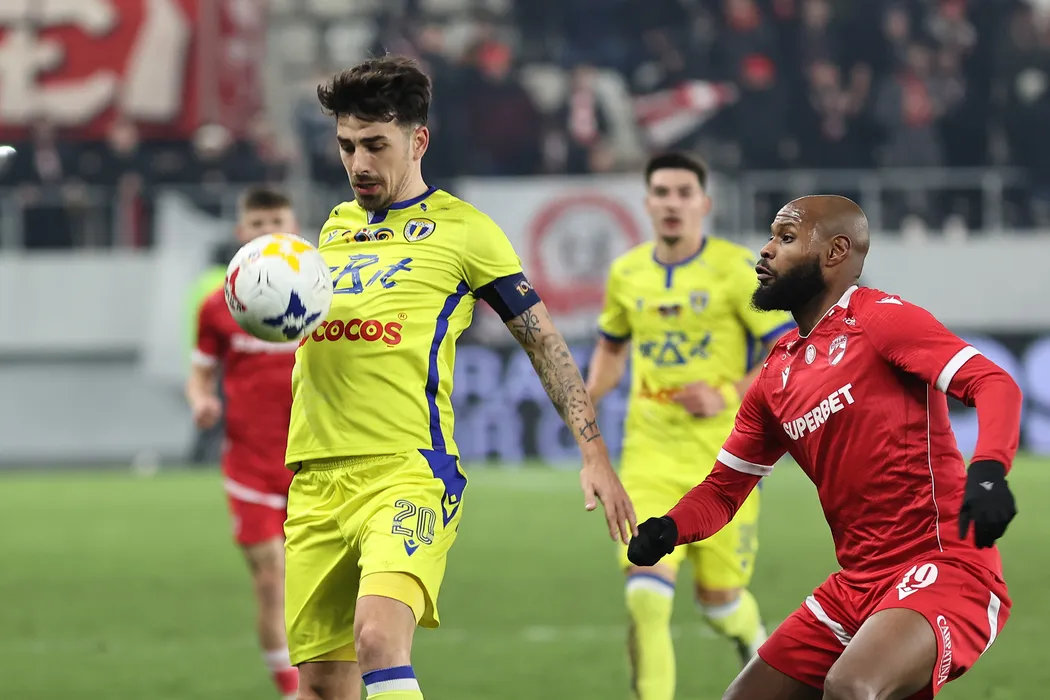 Sergiu Cătălin Hanca și Hakim Djamel Abdallah în meciul de fotbal dintre Dinamo București și FC Petrolul Ploiești, contând pentru Cupa României Betano, desfășurat pe Stadionul Arcul de Triumf din București, miercuri 18 decembrie 2024. © FOTO: Gheorghe FLUȘTER/SPORT PICTURES