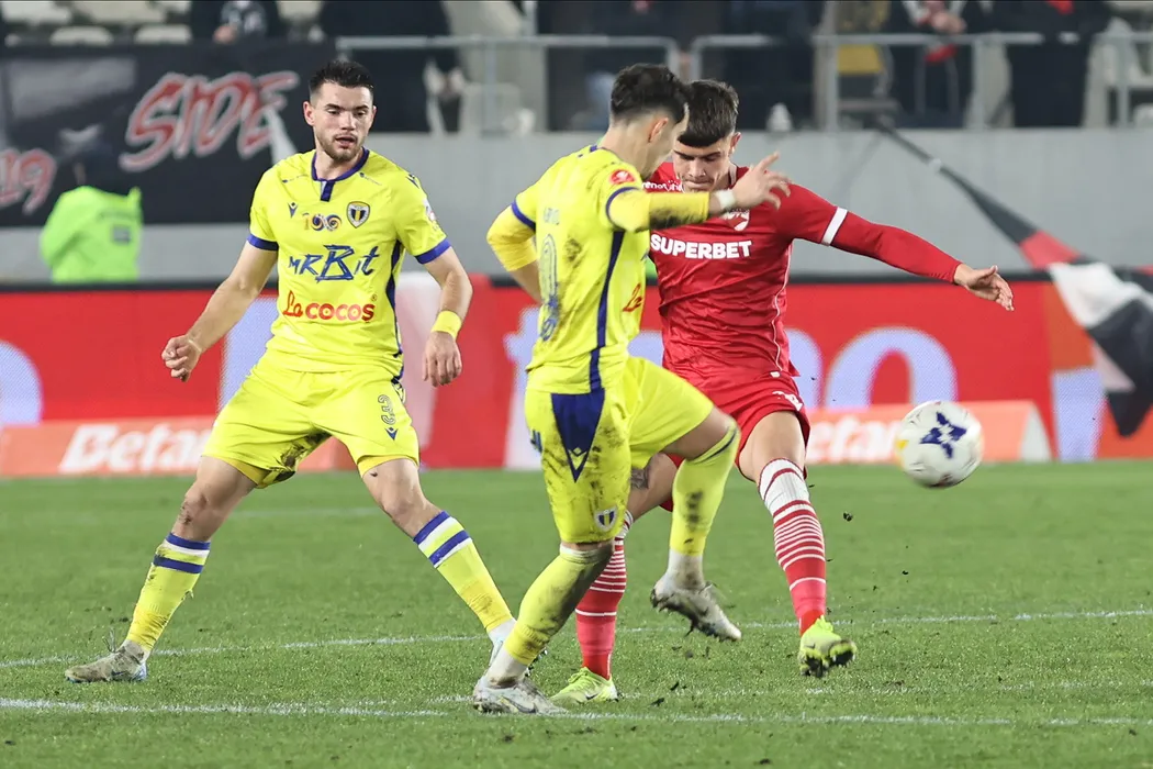 Alexandru Iulian Stănică și Raul Codruț Rotund în meciul de fotbal dintre Dinamo București și FC Petrolul Ploiești, contând pentru Cupa României Betano, desfășurat pe Stadionul Arcul de Triumf din București, miercuri 18 decembrie 2024. © FOTO: Gheorghe FLUȘTER/SPORT PICTURES