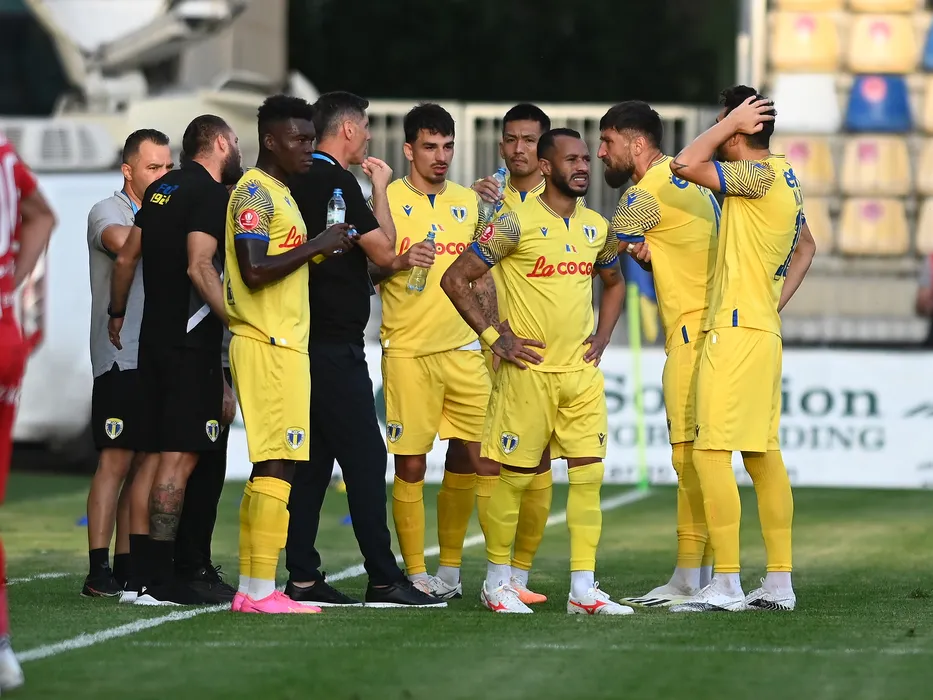Florin Cristian Parvualaturi de Fotbalistii ploiesteni Seniko Romeo Doua, Sergiu Catalin Hanca, Seto Takayuki, Jair Tavares Silva si Paul Papp la o pauza de hidratare luata in meciul de fotbal dintre Petrolul Ploiesti si FC Hermannstadt, din cadrul Superligii Superbet, desfasurat pe Stadionul Ilie Oana din Ploiesti, duminica 24 septembrie 2023. © FOTO:Razvan Pasarica/SPORT PICTURES