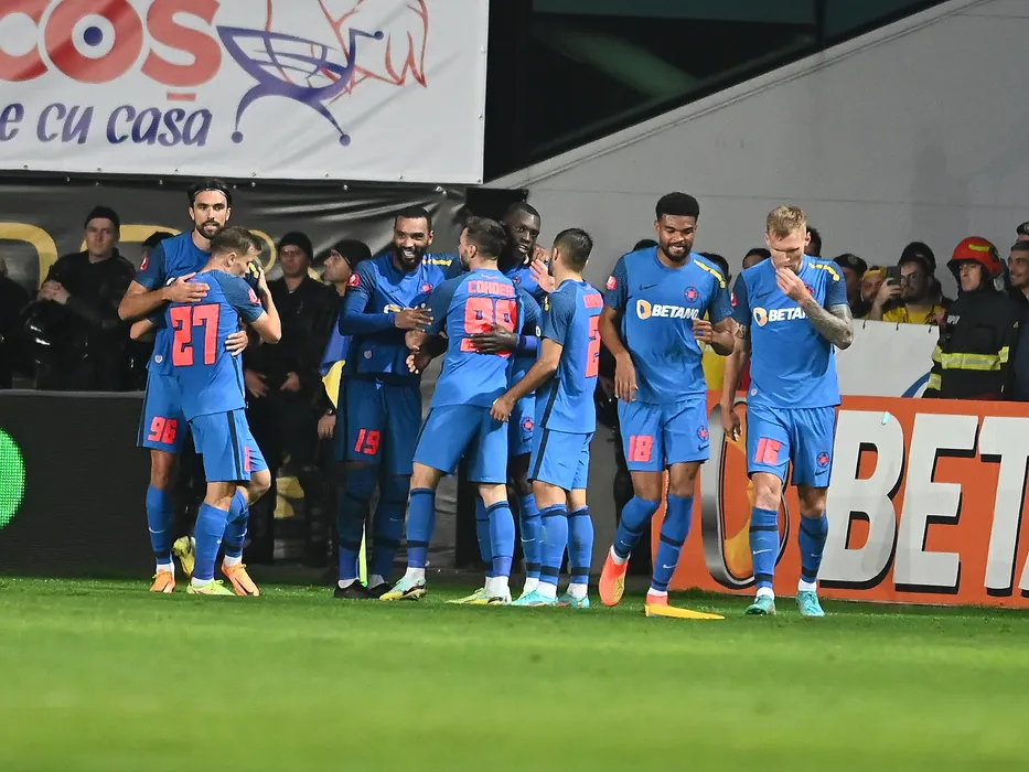 Bucurie a fotbalistilor stelisti dupa un gol marcat cu Andrea Compagno, Abdel Slem Billel Omrani si Sylas Laouari Edjouma Malcom in meciul de fotbal dintre Petrolul Ploiesti si FCSB, contand pentru Superliga Superbet, desfasurat pe Stadionul Ilie Oana din Ploiesti, duminica 9 octombrie 2022. © FOTO:Razvan Pasarica/SPORT PICTURES