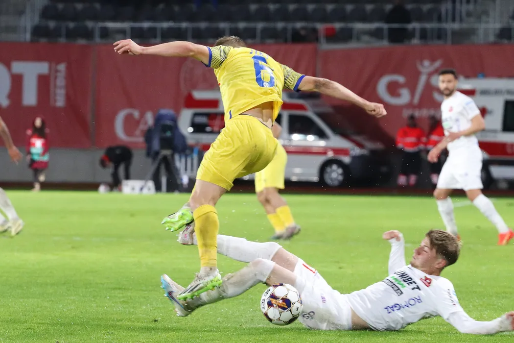 Alexandru Laurențiu Oroian îl deposedează pe Tommi Matti Jyry în meciul de fotbal dintre AFC Hermannstadt Sibiu si FC Petrolul Ploiești, contând pentru Superliga Superbet Play-Out, desfășurat pe Stadionul Municipal din Sibiu, joi 25 aprilie 2024. © FOTO: Valentin MACREA/SPORT PICTURES