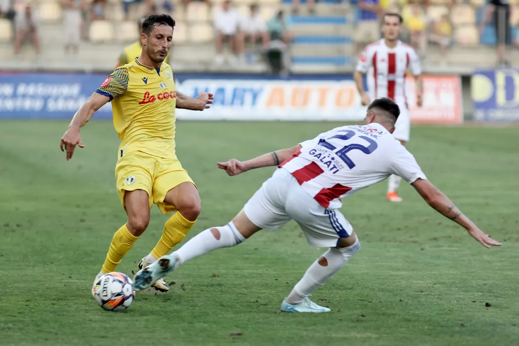 Lucian Mihai Dumitriu și Josip Tomasevic în meciul de fotbal dintre FC Petrolul Ploiești și SC Oțelul Galați, contând pentru Superliga Superbet, desfășurat pe Stadionul Ilie Oană din Ploiești, vineri 23 august 2024. © FOTO: Gică FLUȘTER/SPORT PICTURES