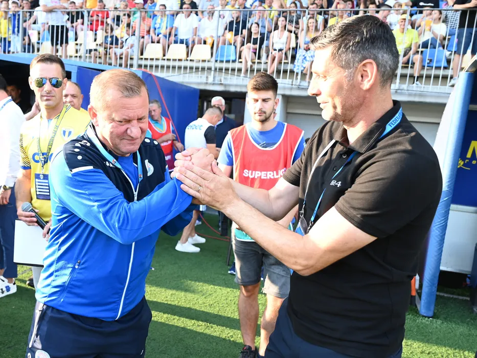 Cei doi antrenori Dorinel Ionel Munteanu si Florin Cristian Parvu se saluta inaintea meciului de fotbal dintre Petrolul Ploiesti si Otelul Galati, din cadrul Superligii Superbet, desfasurat pe Stadionul Ilie Oana din Ploiesti, vineri 1 septembrie 2023. © FOTO:Razvan Pasarica/SPORT PICTURES