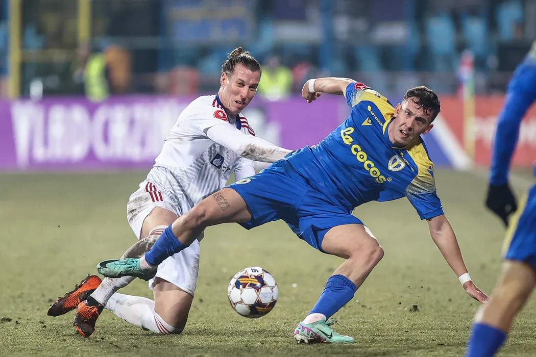 Mihai Alexandru Ișfan și Diego Zivulic în meciul de fotbal dintre ACS Suporter Club Oțelul Galați si ACS Petrolul 52 Ploiești, contând pentru Superliga Superbet, desfășurat pe Stadionul Oțelul din Galați, sâmbătă 27 ianuarie 2024. © FOTO: Sorin PANĂ/SPORT PICTURES