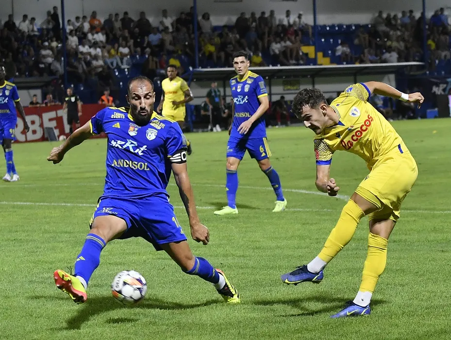 Mario George Bratu și Gabriel Lazăr în meciul de fotbal dintre AFC Unirea 04 Slobozia și Petrolul Ploiești, contând pentru Superliga Superbet, desfășurat pe Stadionul din Clinceni, vineri 16 august 2024. © FOTO: Simion MECHNO/SPORT PICTURES