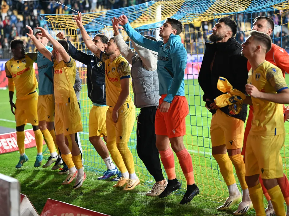 Fotbalistii ploiesteni Gheorghe Teodor Grozav, Mihai Alexandru Esanu, si Paul Papp saluta galeria dupa meciul de fotbal dintre Petrolul Ploiesti si FCSB, din cadrul Superligii Superbet, desfasurat pe Stadionul Ilie Oana din Ploiesti, sambata 28 octombrie 2023. © FOTO:Razvan Pasarica/SPORT PICTURES