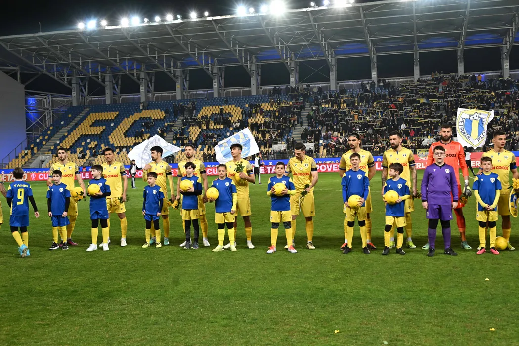 Fotbaliștii ploieșteni la startul meciului de fotbal dintre Petrolul Ploiesti si Sepsi OSK Sfantu Gheorghe, contând pentru Superliga Superbet, desfășurat pe Stadionul Ilie Oana din Ploiesti, vineri 8 martie 2024. © FOTO: Răzvan PĂSĂRICĂ/SPORT PICTURES