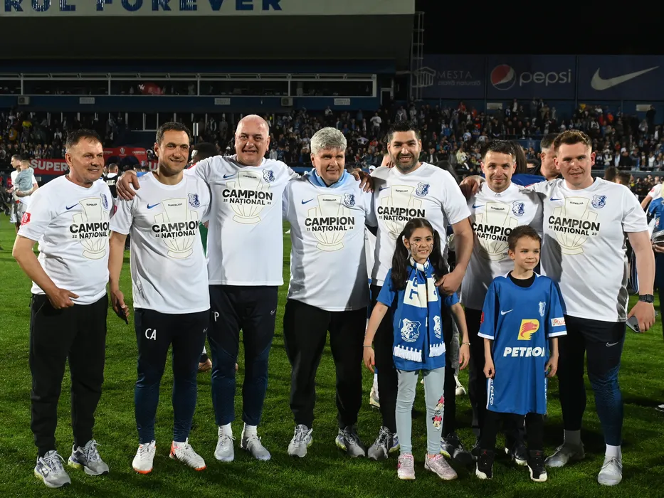 Staff-ul tehnic printre care Catalin Cristian Anghel, Stefan Gabriel Preda si Alexandru Matel se bucura dupa castigarea Superligii in urma meciului de fotbal dintre Farul Constanta si FCSB, desfasurat pe Stadionul central al Academiei Gheorghe Hagi din Ovidiu, duminica 21 mai 2023. © FOTO:Razvan Pasarica/SPORT PICTURES