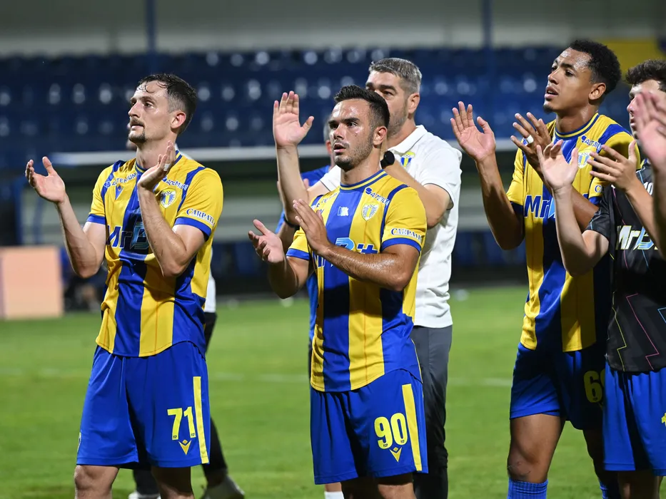 Fotbalistii ploiesteni printre care Franjo Prce, Iustin Alexandru Raducan si Cedric Benjamin Roche Yohan saluta galeria dupa meciul de fotbal dintre Metaloglobus Bucuresti si Petrolul Ploiesti, contand pentru Superliga Superbet, desfasurat pe Clinceni Arena din Clinceni, vineri 25 iulie 2025. © FOTO:Razvan Pasarica/SPORT PICTURES