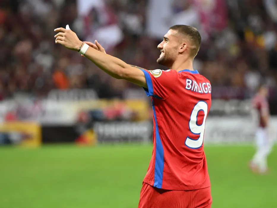 George Daniel Bîrligea se bucură dupa un gol marcat in meciul de fotbal dintre Rapid Bucuresti si FCSB, din cadrul Superligii Superbet, desfasurat pe Arena Nationala din Bucuresti, duminica 17 august 2025. © FOTO:Razvan Pasarica/SPORT PICTURES
