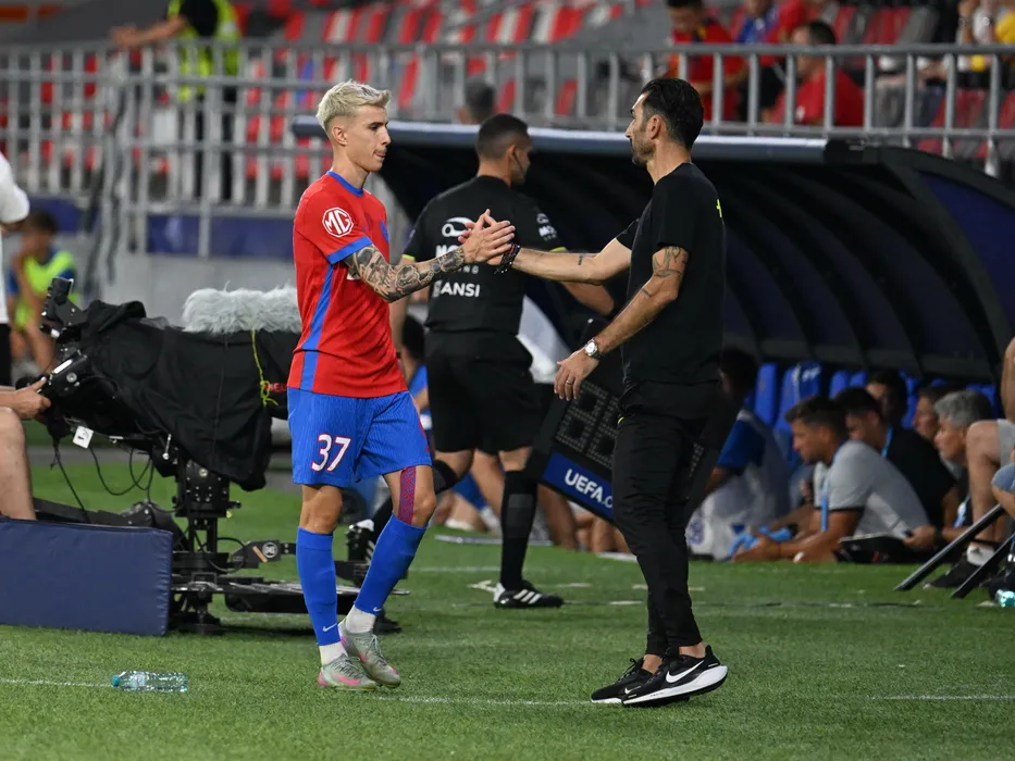 Elias Charalambous îl felicita pe Octavian George Popescu la iesirea de pe eteren din meciul dintre FCSB si Farul Constanta, contand pentru Superliga Superbet, desfasurat pe Stadionul Steaua-Ghencea din Bucuresti, sambata 26 iulie 2025. © FOTO:Razvan Pasarica/SPORT PICTURES