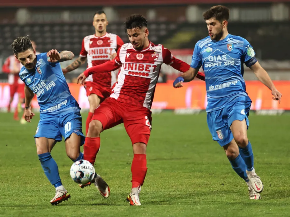 Antonio Alexandru Bordusanu, Simo Roumpoulakou si Paul Alexandru Iacob in meciul de fotbal dintre Dinamo Bucuresti si Chindia Targoviste, contand pentru Liga 1 Casa Pariurilor, desfasurat pe stadionul Dinamo din Bucuresti, luni 13 decembrie 2021. © FOTO:Gheorghe Fluster/SPORT PICTURES